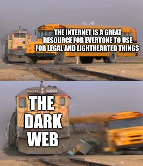 I liked your meme depicting the dark web, not only does it make a good analogy with the trains but it brings up the dark web which is a very important issue. Many of the internets problems come from the dark web. The dark web is one of the reasons we have virus protection in this modern age. I remember I gave my computer a virus trying to go to a sketchy website without realizing. People need to understand the internet and its consequences.
